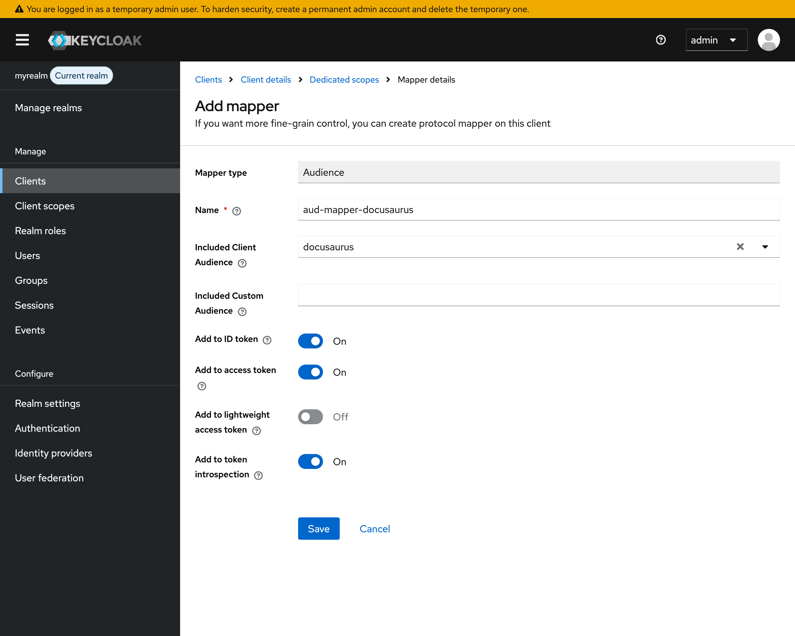 Inside the console, create a realm myrealm and add a client called docusaurus. Make sure the client has the correct redirect URI configured: http://localhost/oauth2/callback